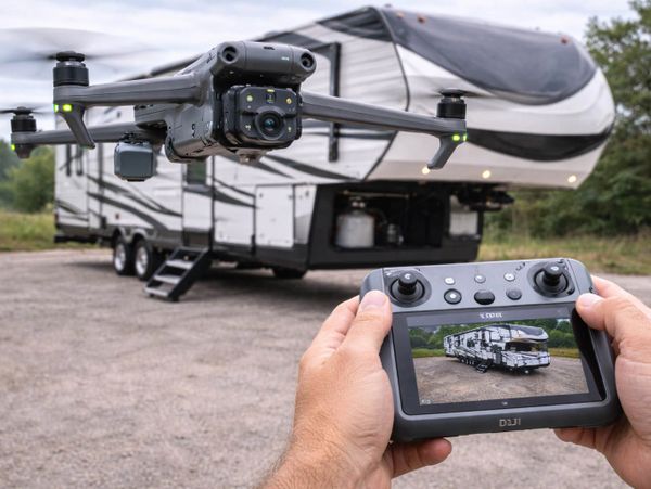 Drone inspections use aerial photography to capture detailed views of RV roofs, front caps, and other elevated or hard-to-reach areas. This technology allows for comprehensive documentation of roof layout, components, and surface conditions without physically walking on the RV.